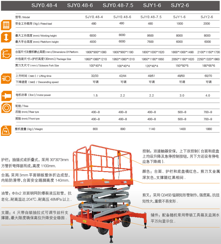 移動剪叉式高空作業平臺采用全錳鋼剪刀式機械結構,使升降臺起升后有很高的安全穩定性,寬大的作業平臺和較高的承載能力,也使高空作業范圍更大,效率更高,并適合多人同時作業。